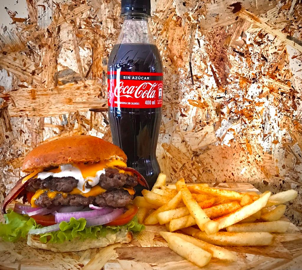 Hamburguesa doble carne, tocineta, queso cheddar y vegetales, papas francesas y Coca-cola Sin Azucar 400ml