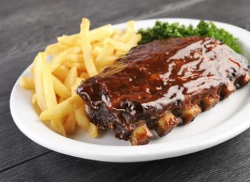 250 Gr (peso crudo ) de costillas de cerdo ahumadas con salsa BBQ, papas a la francesa(150gr,peso crudo ) y ensalada de verdura (tomate, lechuga y cebolla).