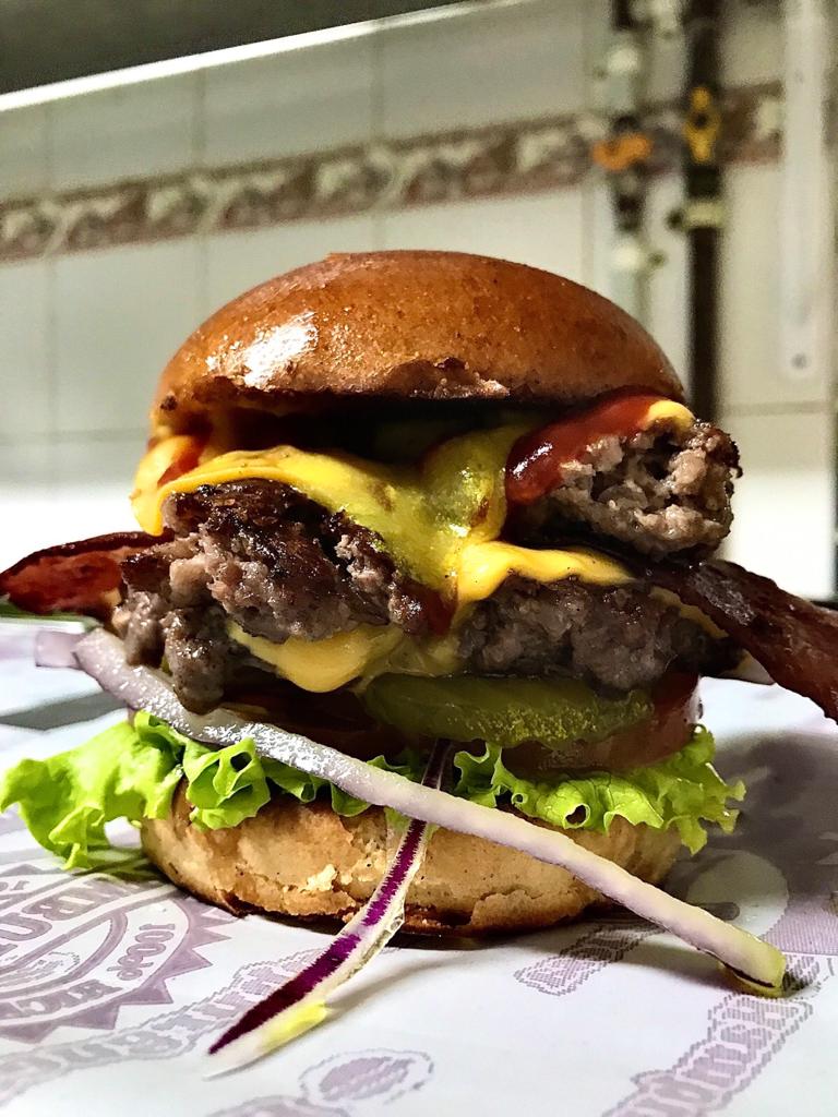 Hamburguesa 100% doble carne de res, queso americano doble, pepinillos, tocineta, lechuga, tomate, cebolla, salsa de tomate y mostaza.