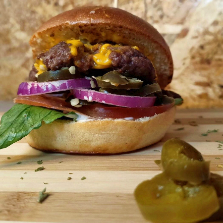 hamburguesa 100% carne de res, en pan de mantequilla, mayonesa de ajo, lechuga, tomate, cebolla y pepinillos.