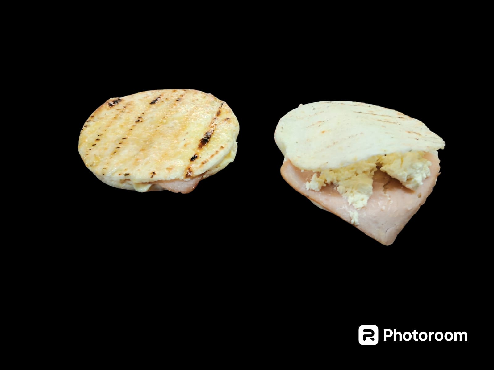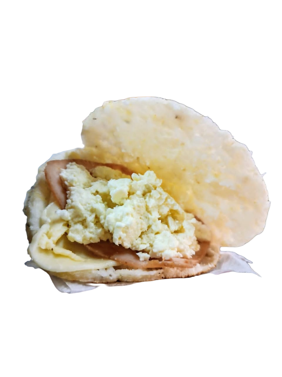 Arepa de maíz peto rellena de queso doble crema, queso campesino y jamón de cerdo ahumado.