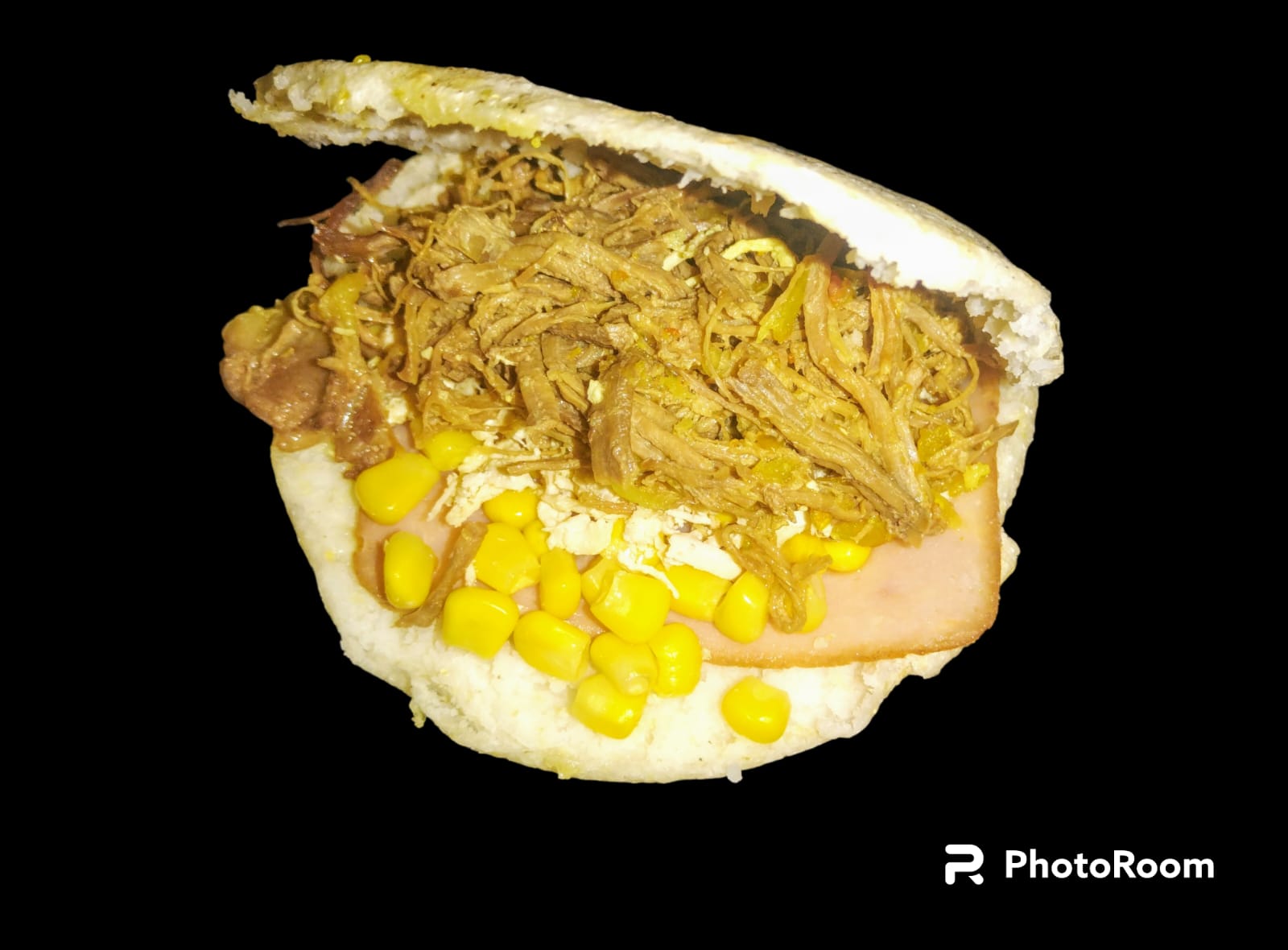 Arepa de maíz peto rellena, queso, jamón de cerdo, carne, pollo, maíz tierno.