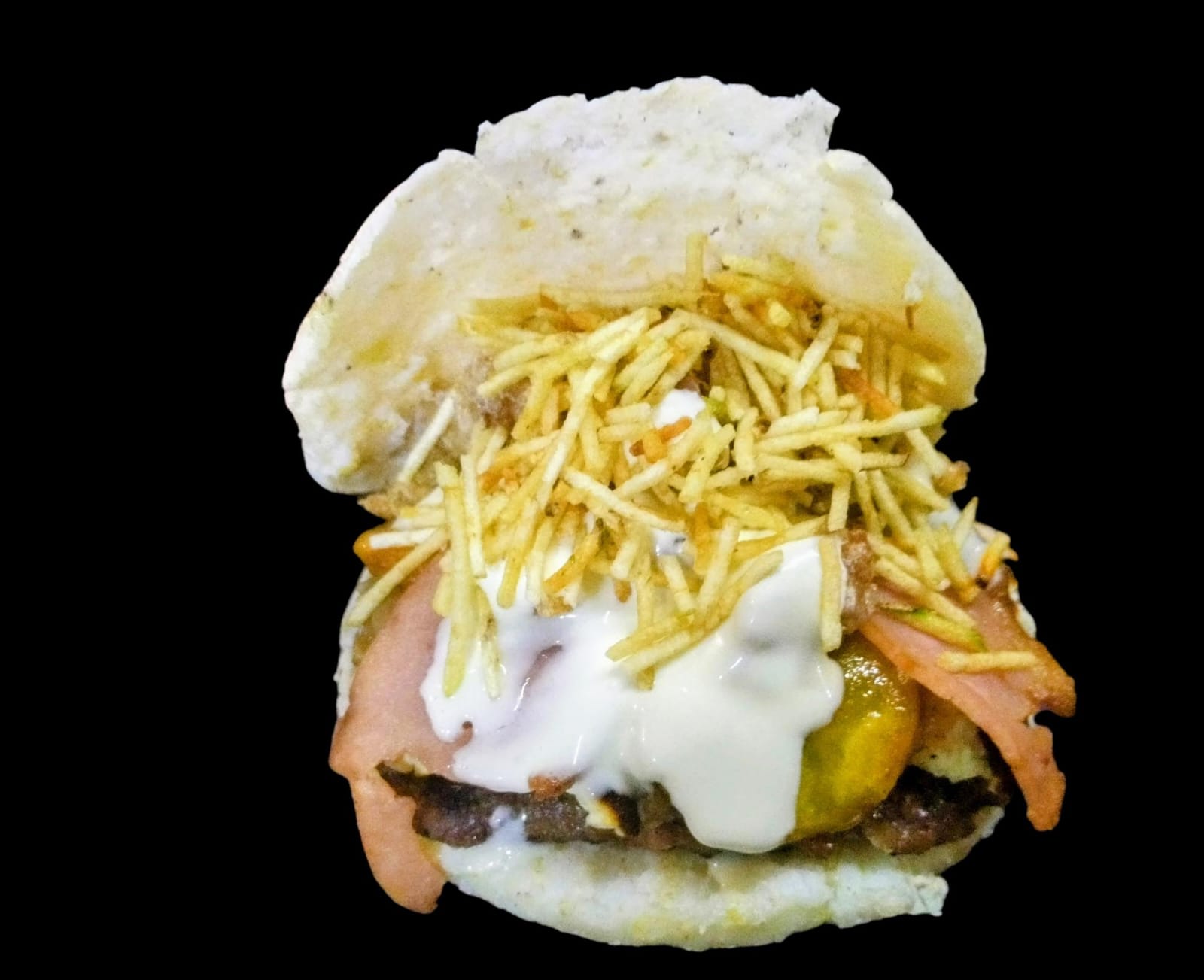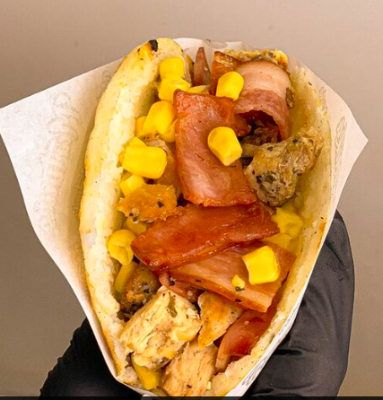 Arepa rellena de queso, carne de hamburguesa, chicharron, maduritos, suero costeño, tocineta, cebolla caramelizada y salsas