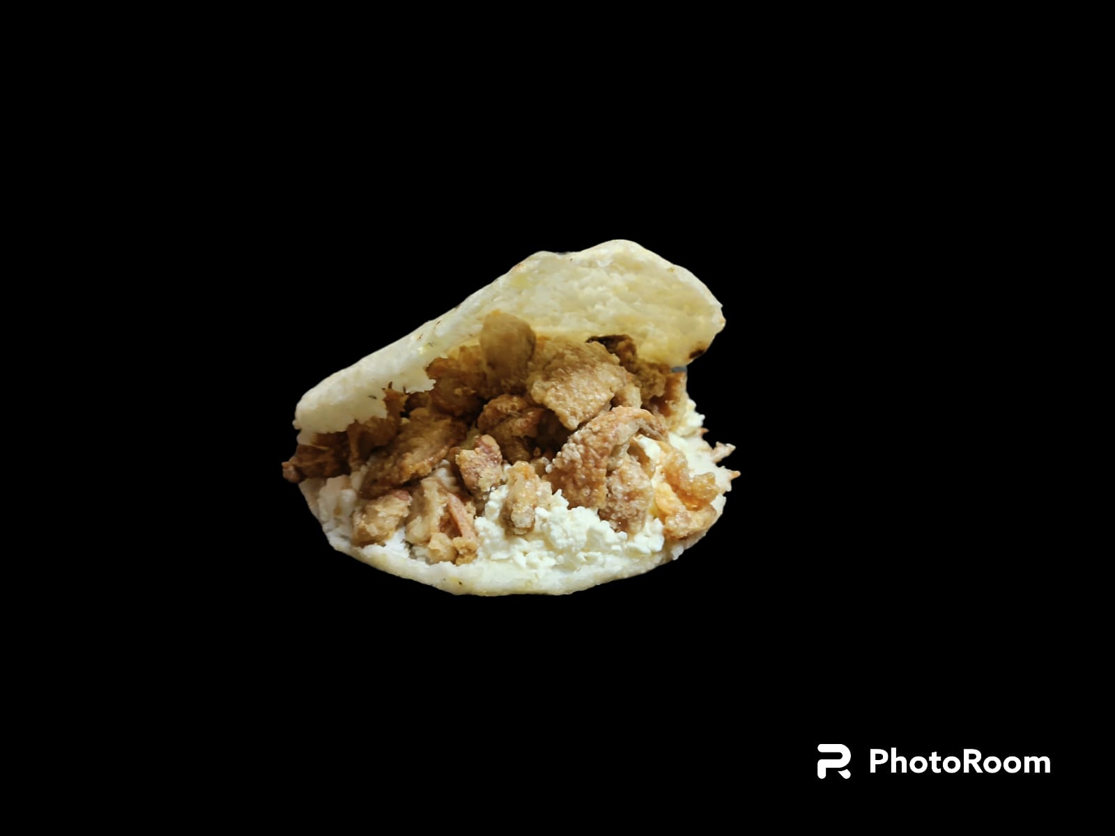 Arepa de maíz peto rellena de queso doble crema y chicharrones crujientes.