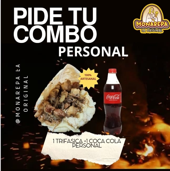 Arepa Trifásica: Arepa de maíz peto rellena, queso, carne, pollo, chicharrón, huevo de codorniz y salsas (tomate, rosada, mayonesa) + Gaseosa 250 Ml