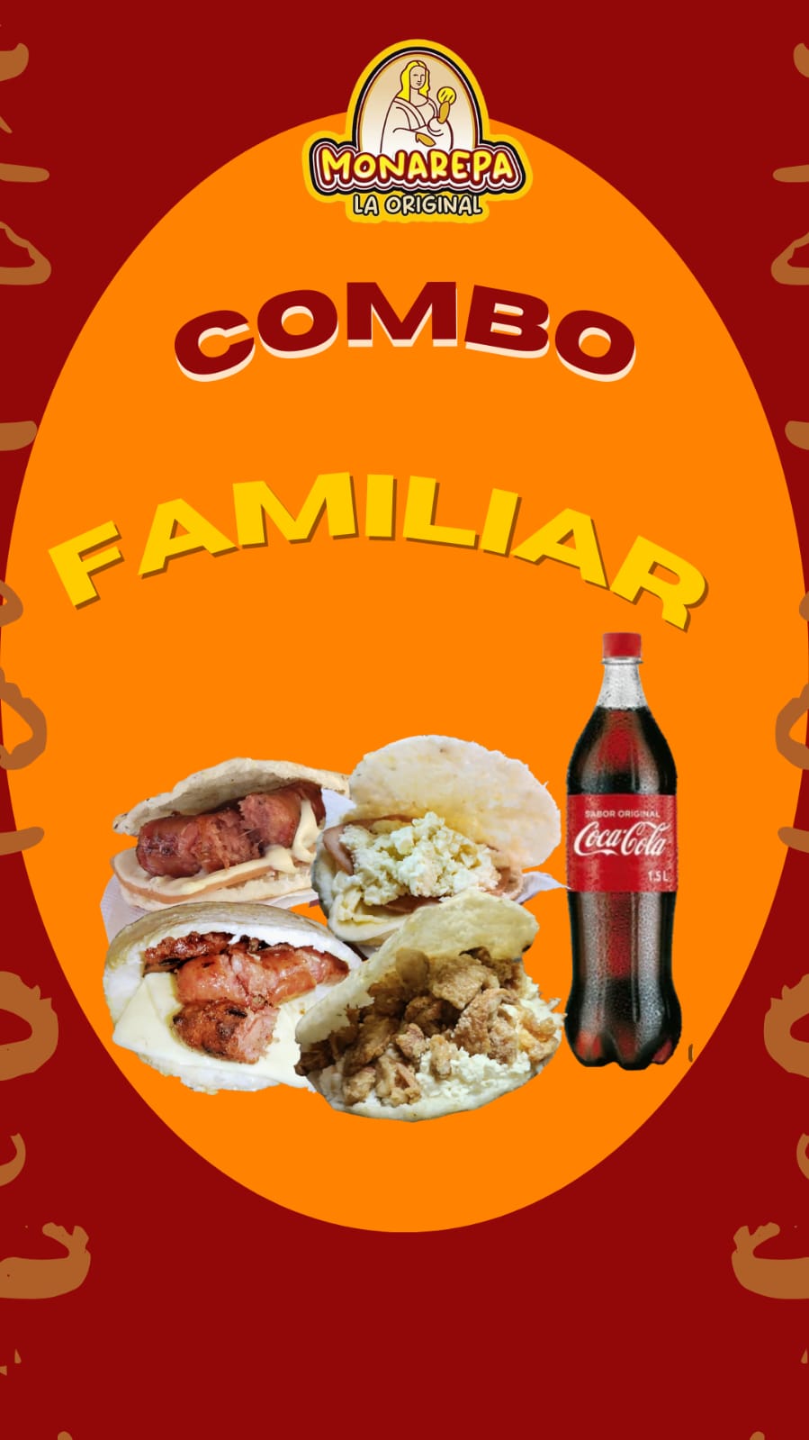 Arepa Tripleta*1 + Arepa Ranchera*1 + Arepa La Suegra*1 + Coca Cola 1.5 Lt*1 + Arepa Contenta*1