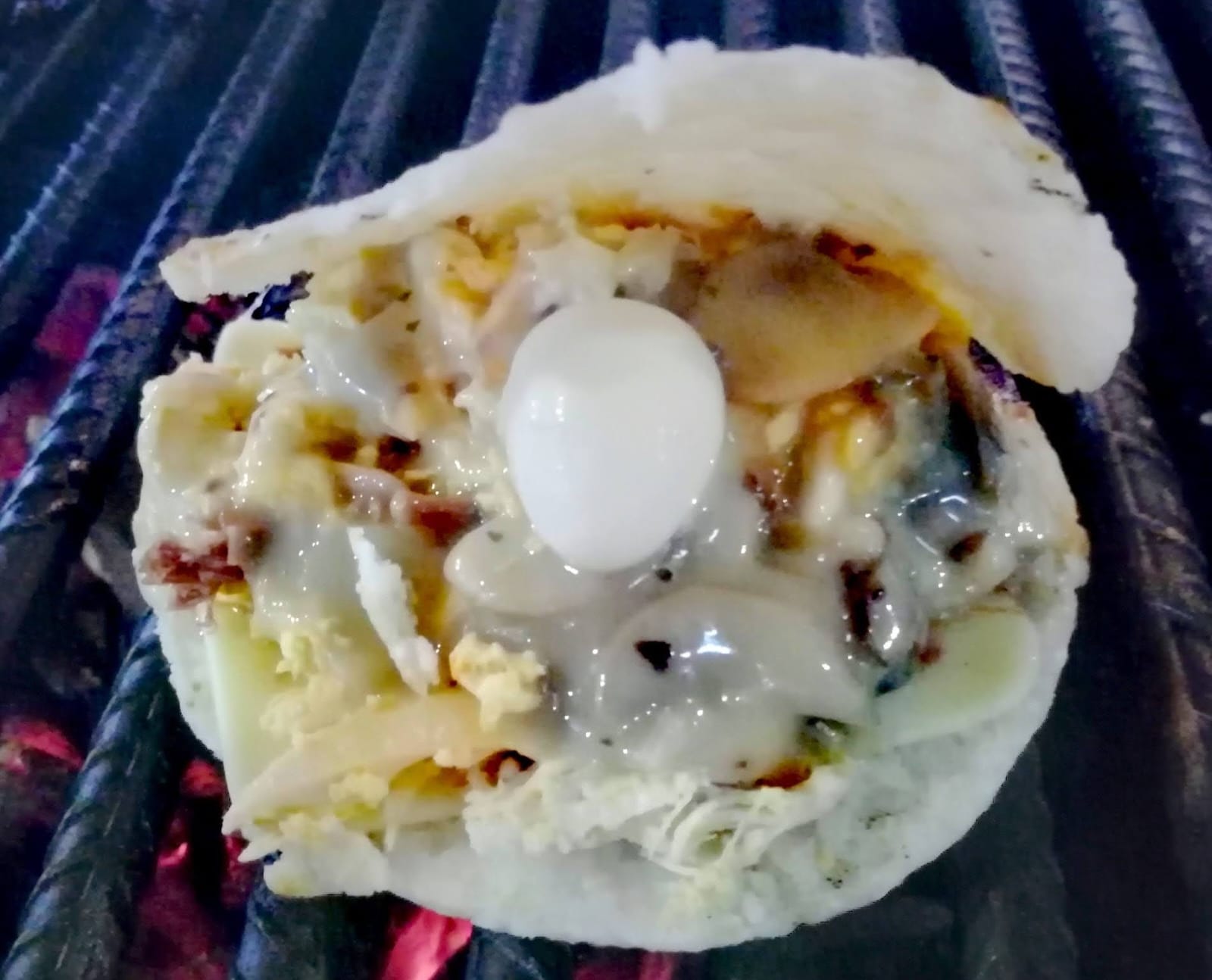 Arepa de maíz peto rellena de queso, huevo, maíz tierno, champiñones en salsa.