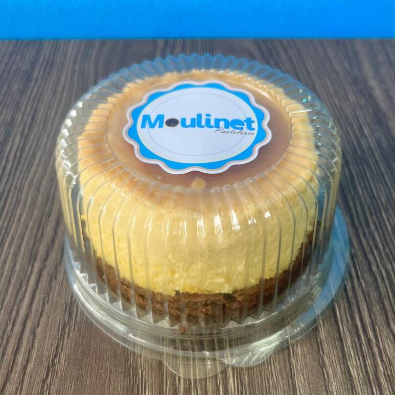 Postre frío elaborado con una fina capa de galleta triturada y base de queso, con una suave capa salsa de su elección.