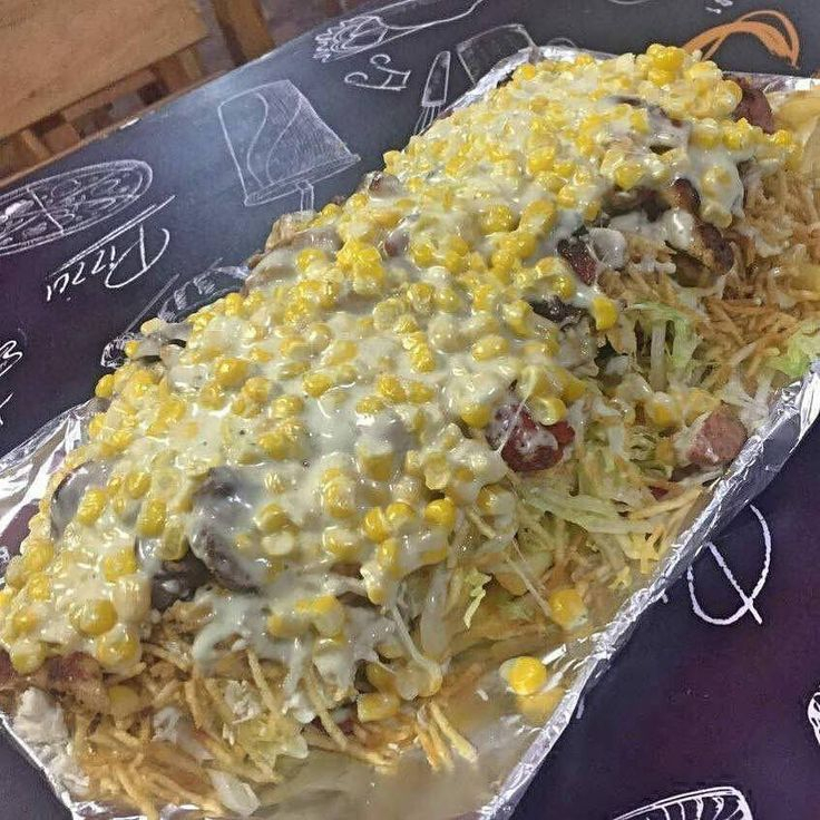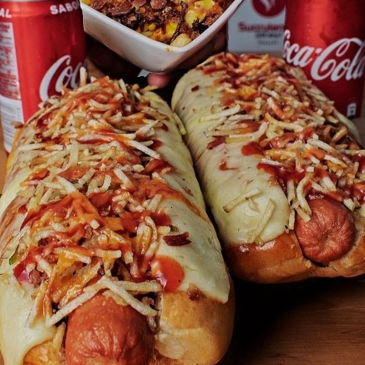 Perro caliente americano con papas fosforito, queso, salsas y cebolla a preferencia