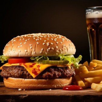 Hamburguesa 100% carne de res con queso, papas fosforito, lechuga, tomate y cebolla al estilo de la casa