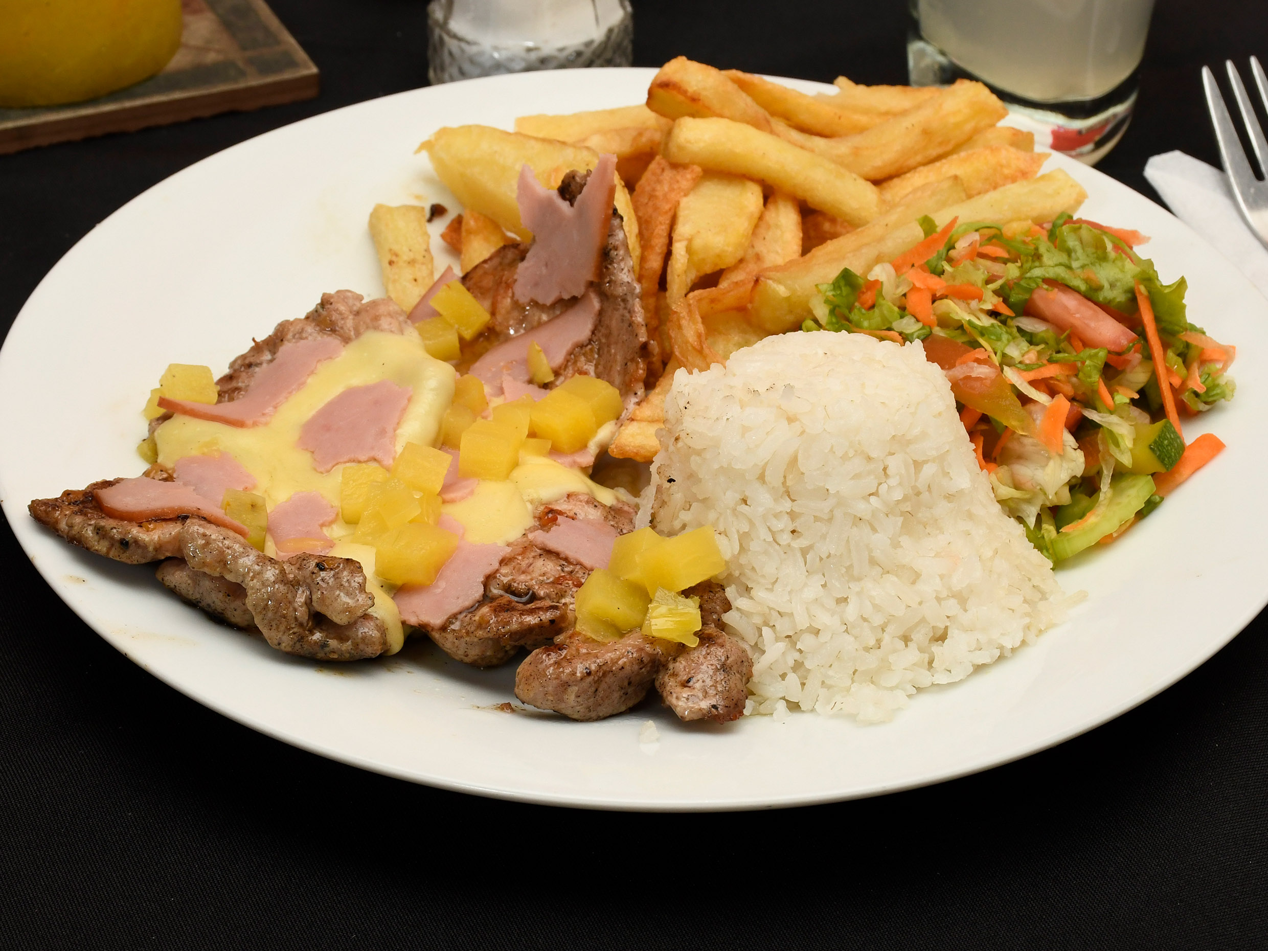 Lomo de Cerdo a la parrila 200grs con jamon, piña y queso,acompañado de arroz, papas a la francesa y ensalada de la casa.