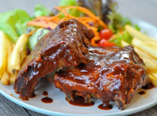 Costillas de cerdo bañadas en salsa BBQ acompañado de arroz, 70 gr de papas a la francesa y ensalada de la casa
