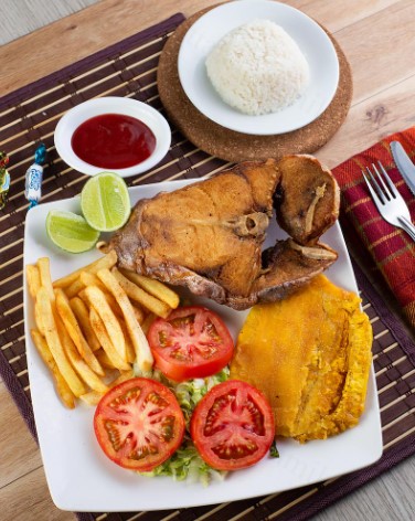 Filete de bagre frito 200grs, acompañado de arroz, francesas y ensalada