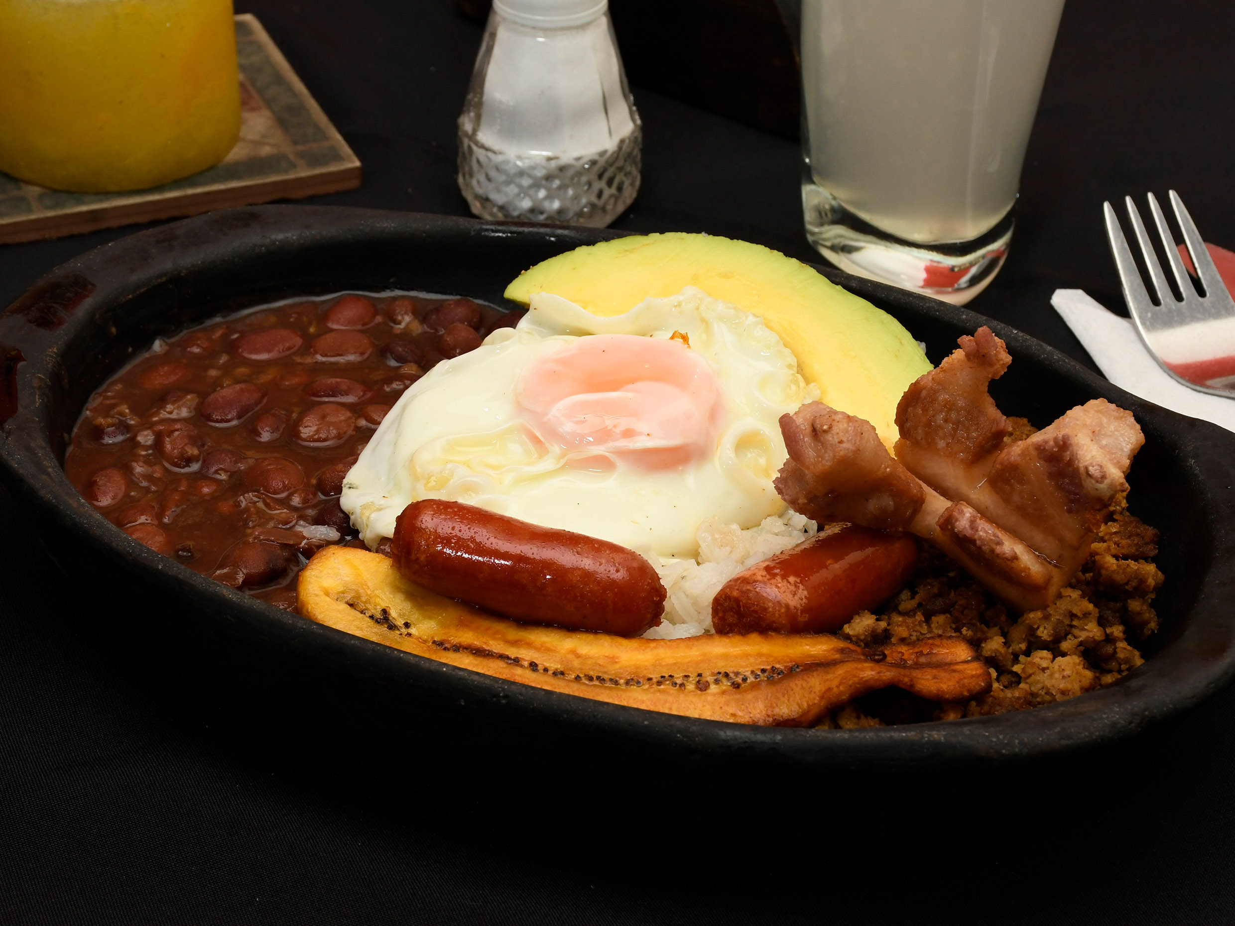 Bandeja Paisa con chicharrón, arroz, plátano, aguacate, chorizo, carne molida y huevo