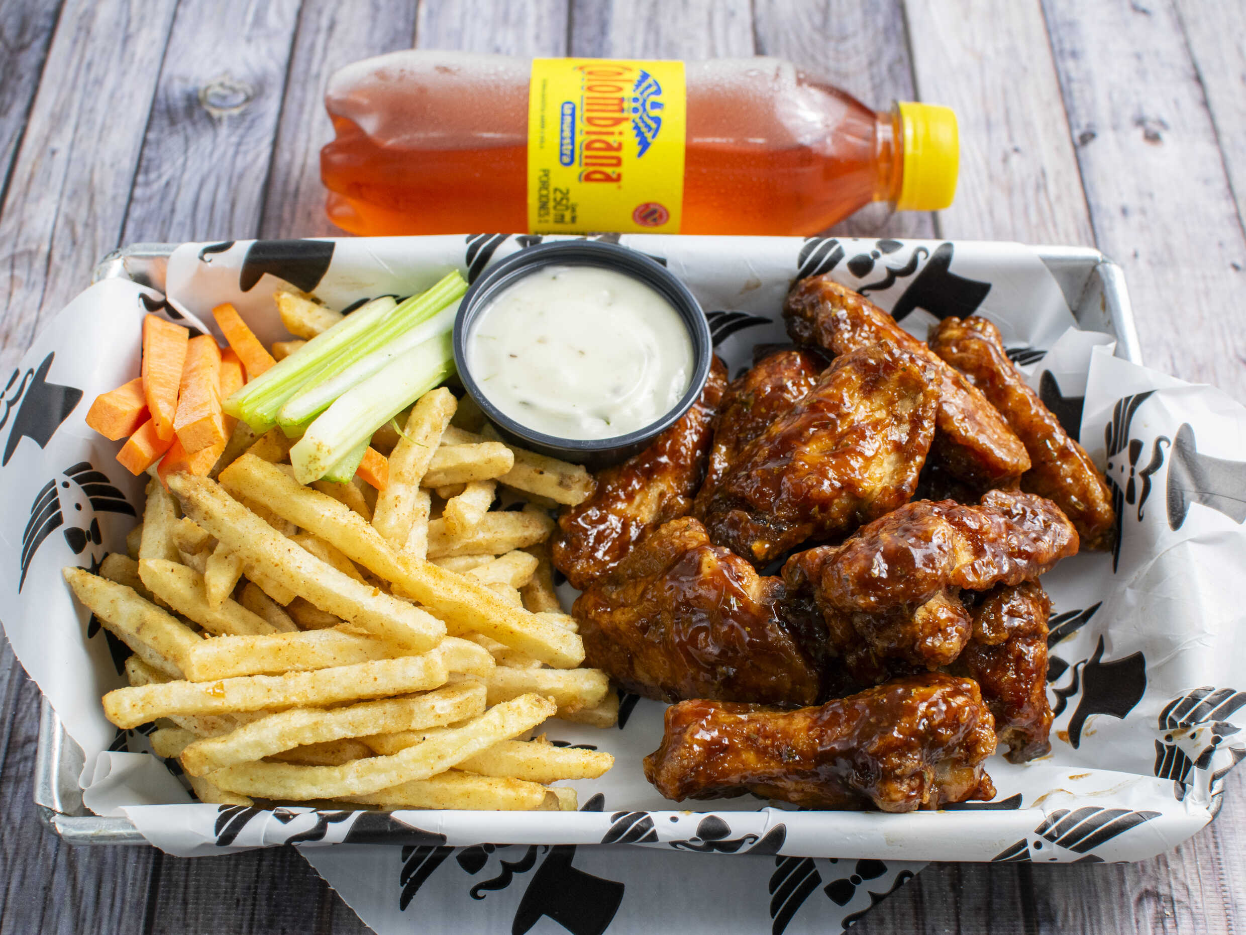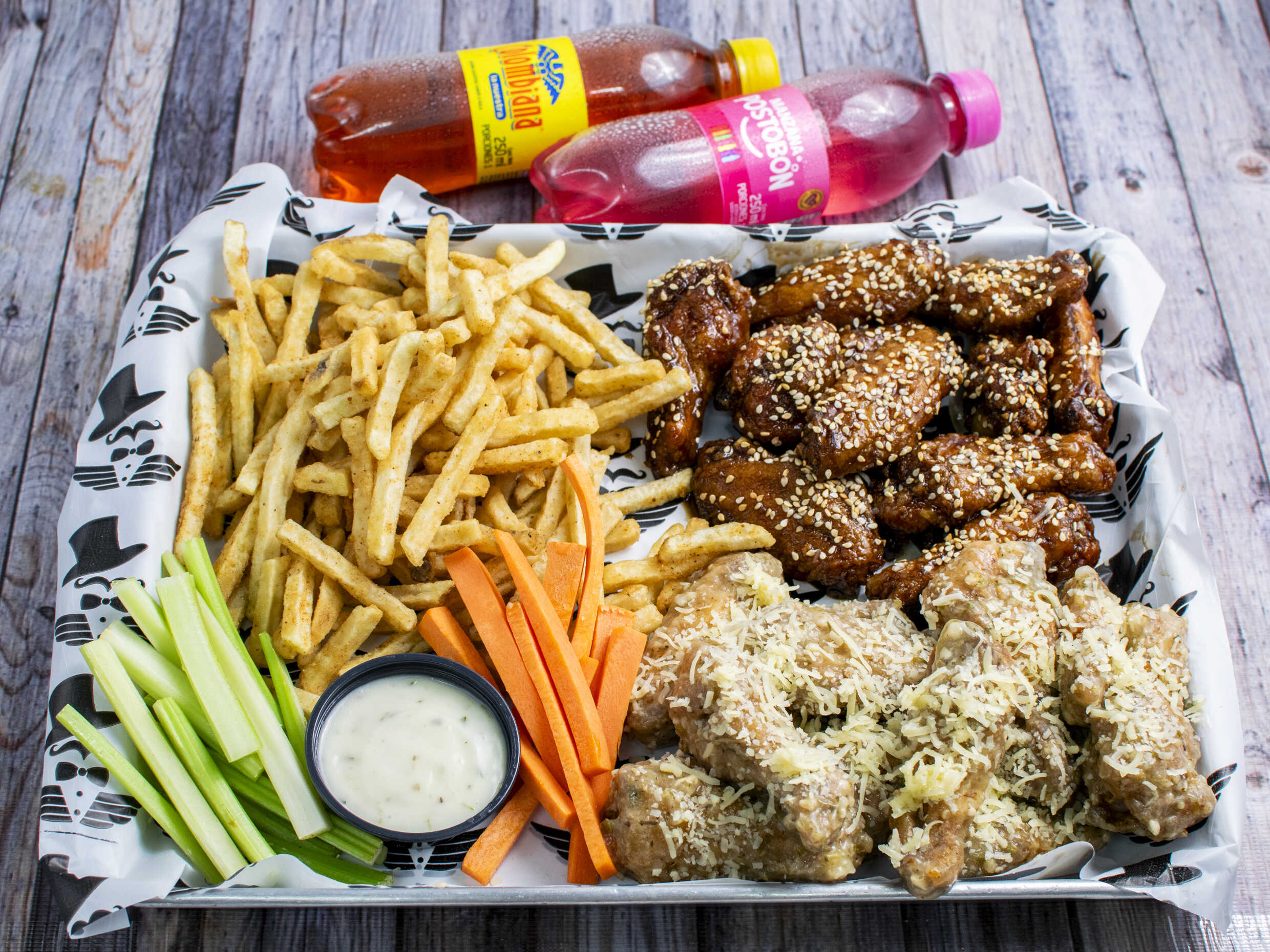 6 Alitas bañadas en la salsa de su elección, 1 hamburguesa tocineta, 1 porción de papa francesa artesanal y dos gaseosas de 250ml