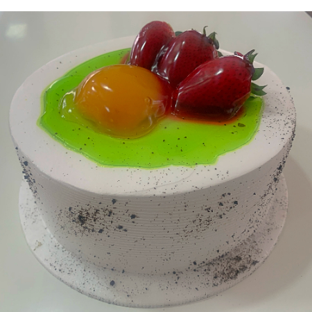 Postre tradicional, con dos capas de merengue relleno de fresa y durazno.