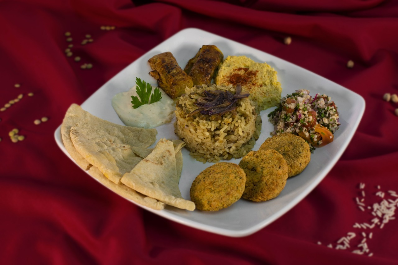 Falafel elaborado por medio de aire caliente (sin freir), rollos de repollo rellenos de hongos, arroz de lentejas con cebolla caramelizada, hummus, crema de almendras y pan árabe. Variedad de sabores y texturas en este nutritivo mix.
