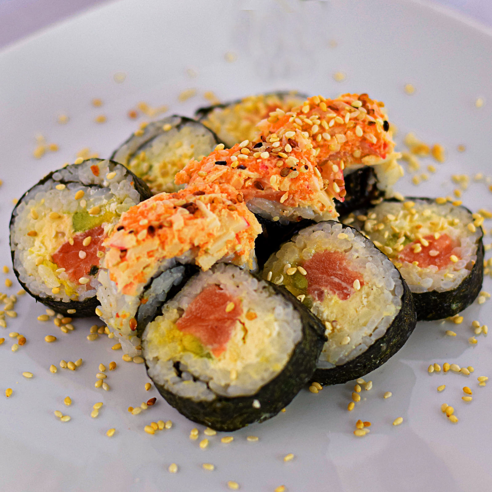 12 Bocados, Relleno de queso crema aguacate, piel de salmon crocante, vegetales tempura con topping de ajonjoli y pasta dinamita (Uramaki).