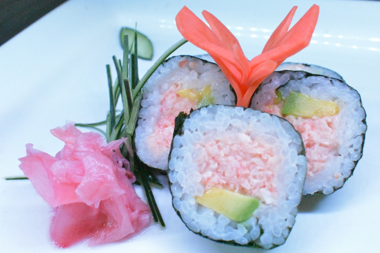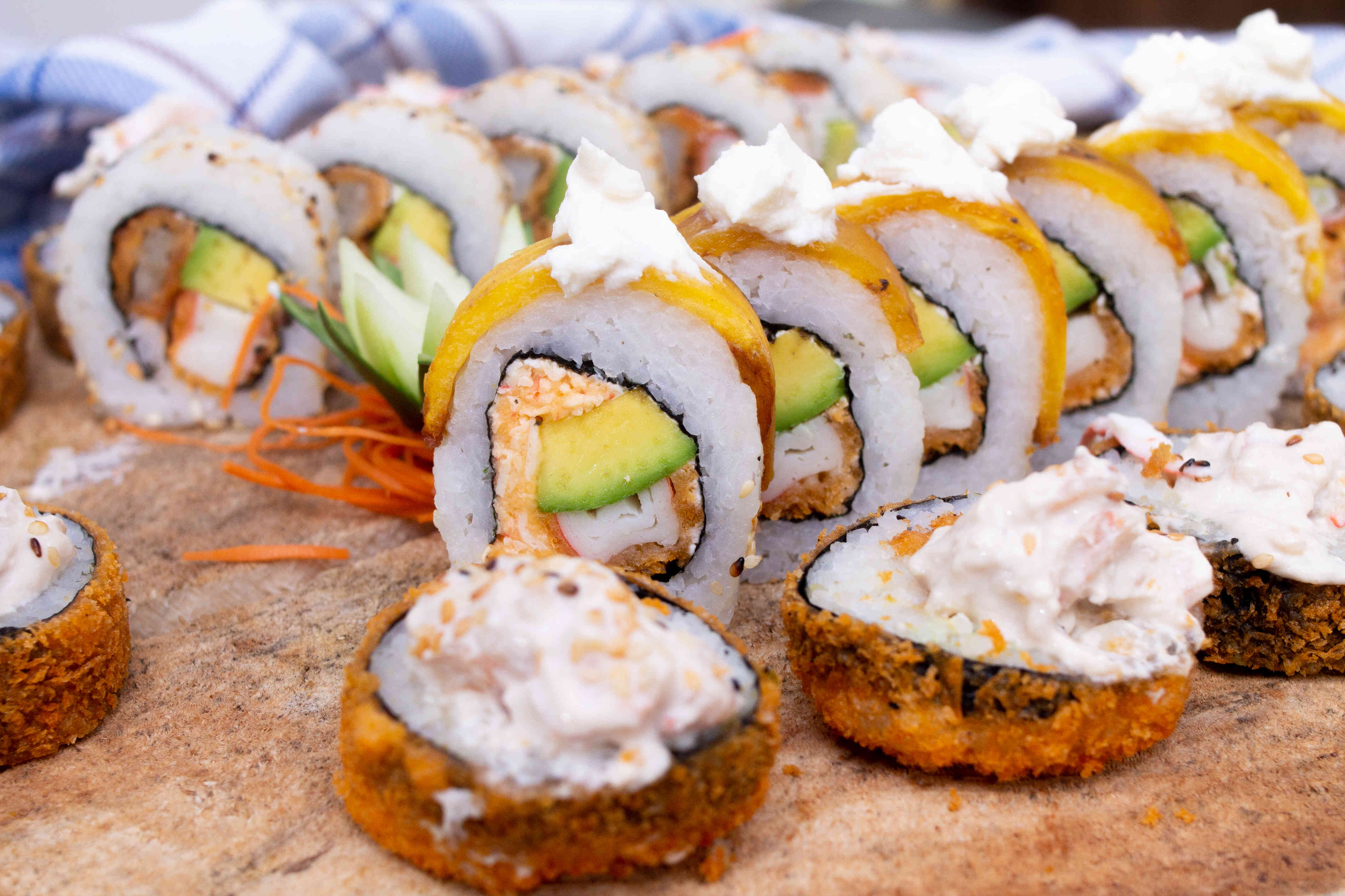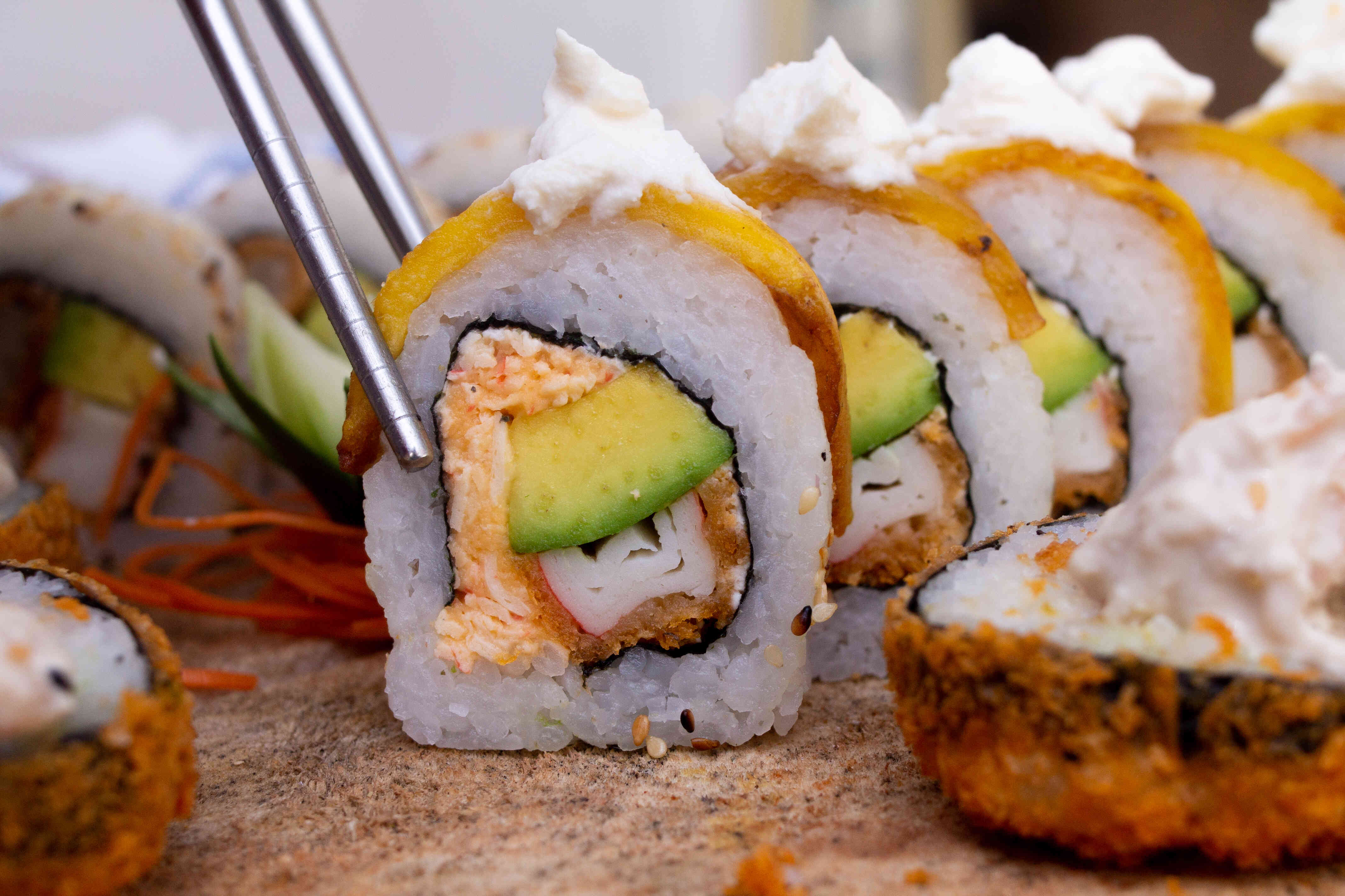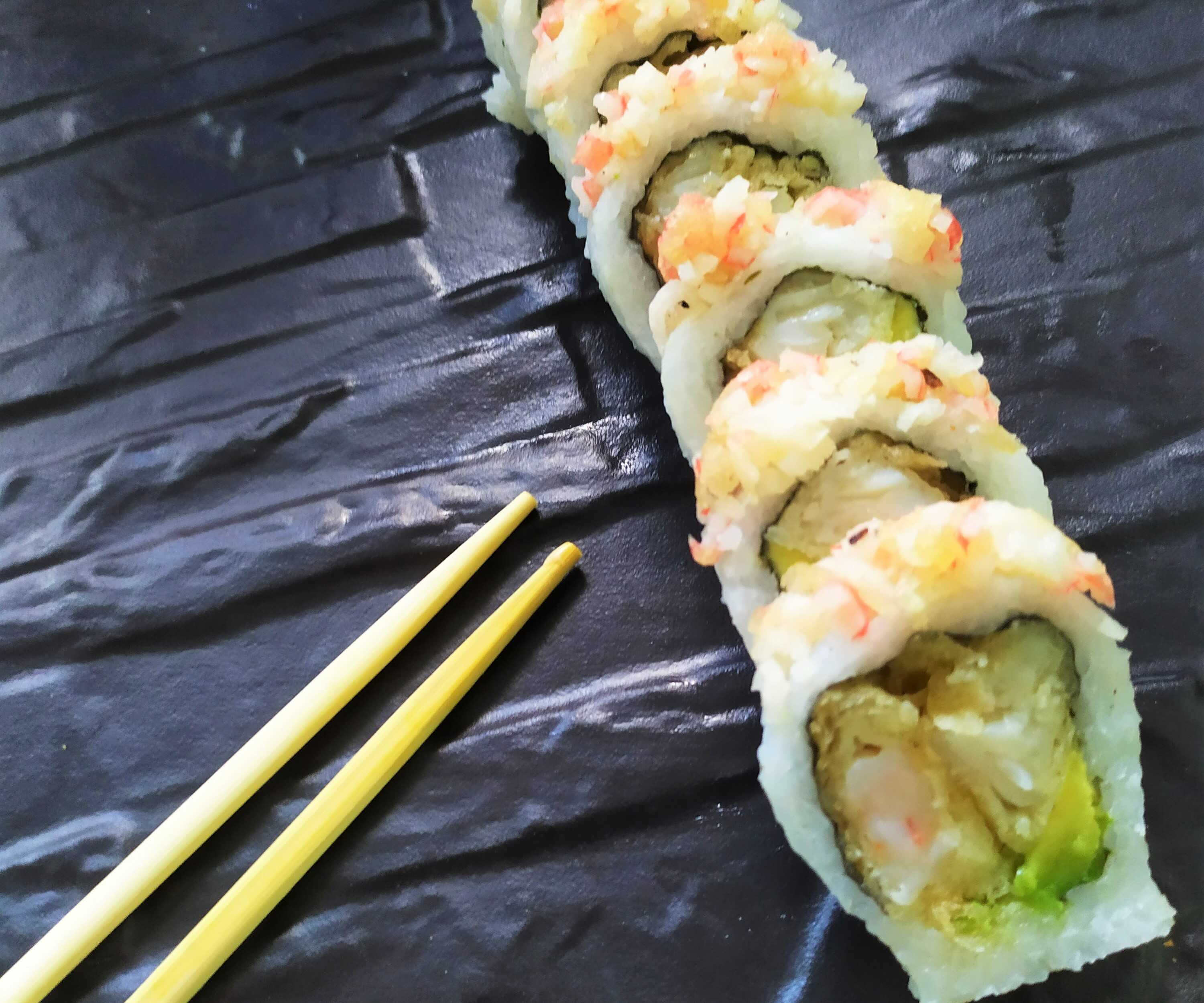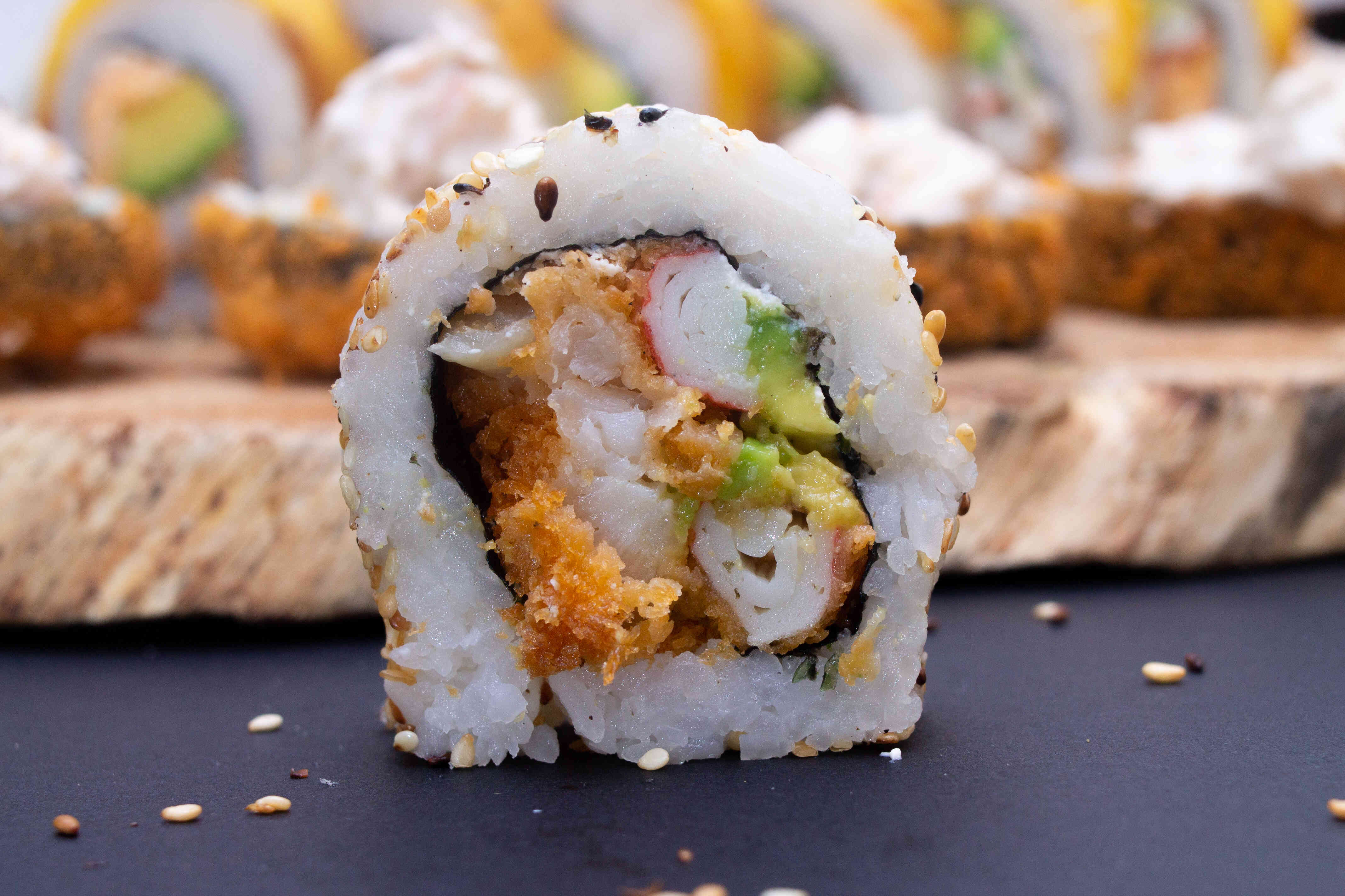 12 Bocados, Relleno de pescado blanco tempura, cebolla larga, aguacate y topping de ensalada de cangrejo. (futomaki).