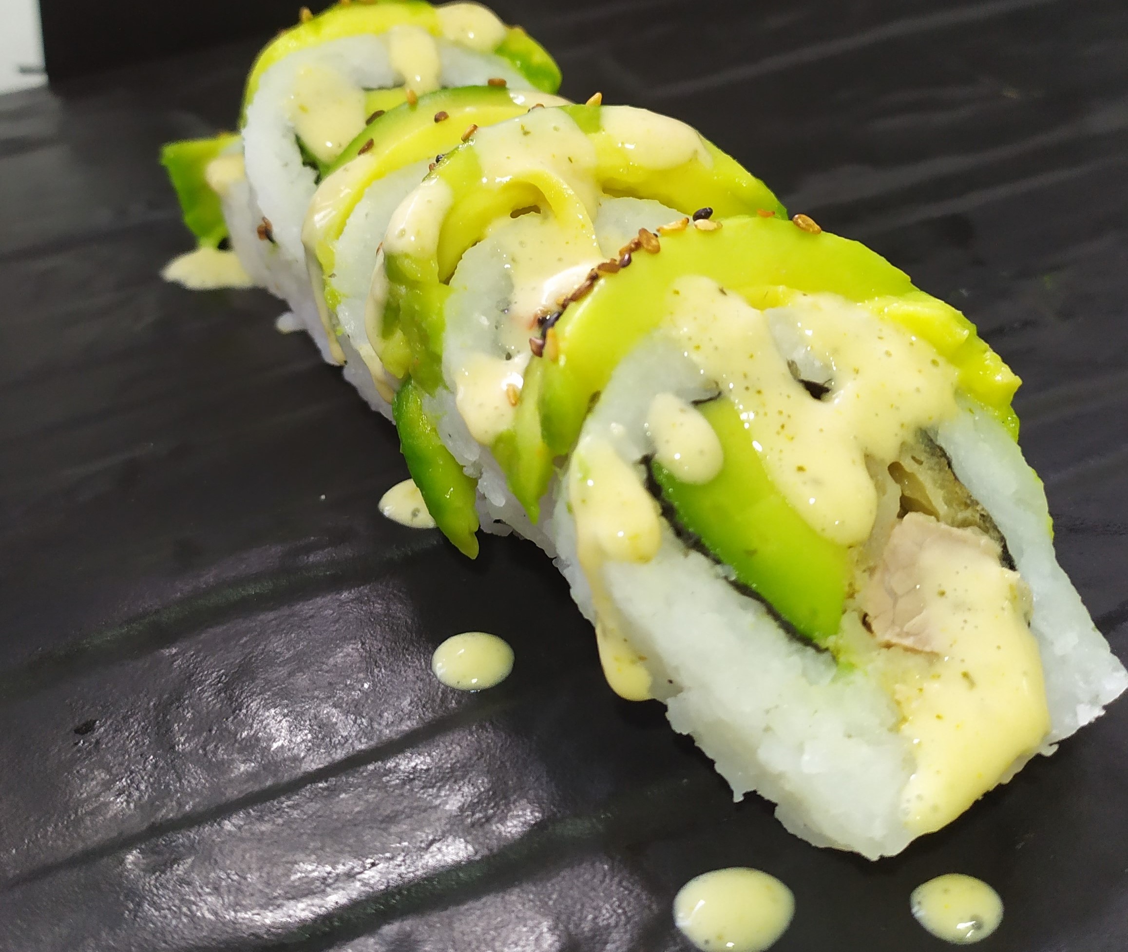 12 Bocados, Relleno en pescado blanco en tempura, queso crema, aguacuate y topping pasta de calamar (Uramaki).