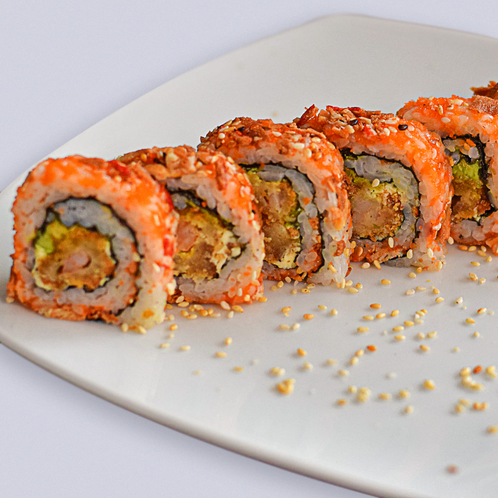 12 Bocados, Roll relleno de queso crema,aguacate, pescado blanco tempura, palmito crispy tempura con topping de crema vulcano.