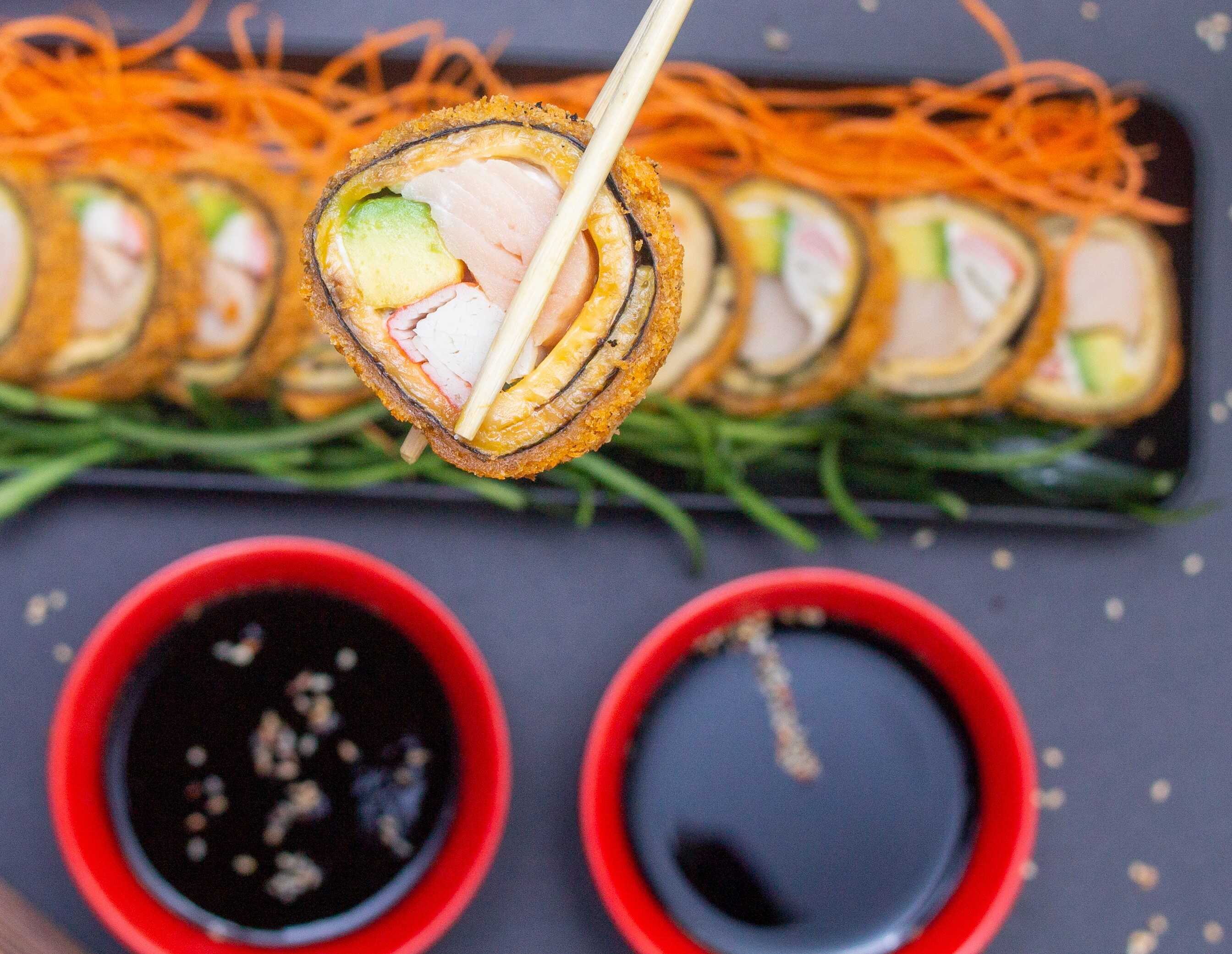 12 Bocados, Roll de plátano maduro, relleno de queso crema, aguacate, salmón fresco, palmito fresco (futomaki tempura)