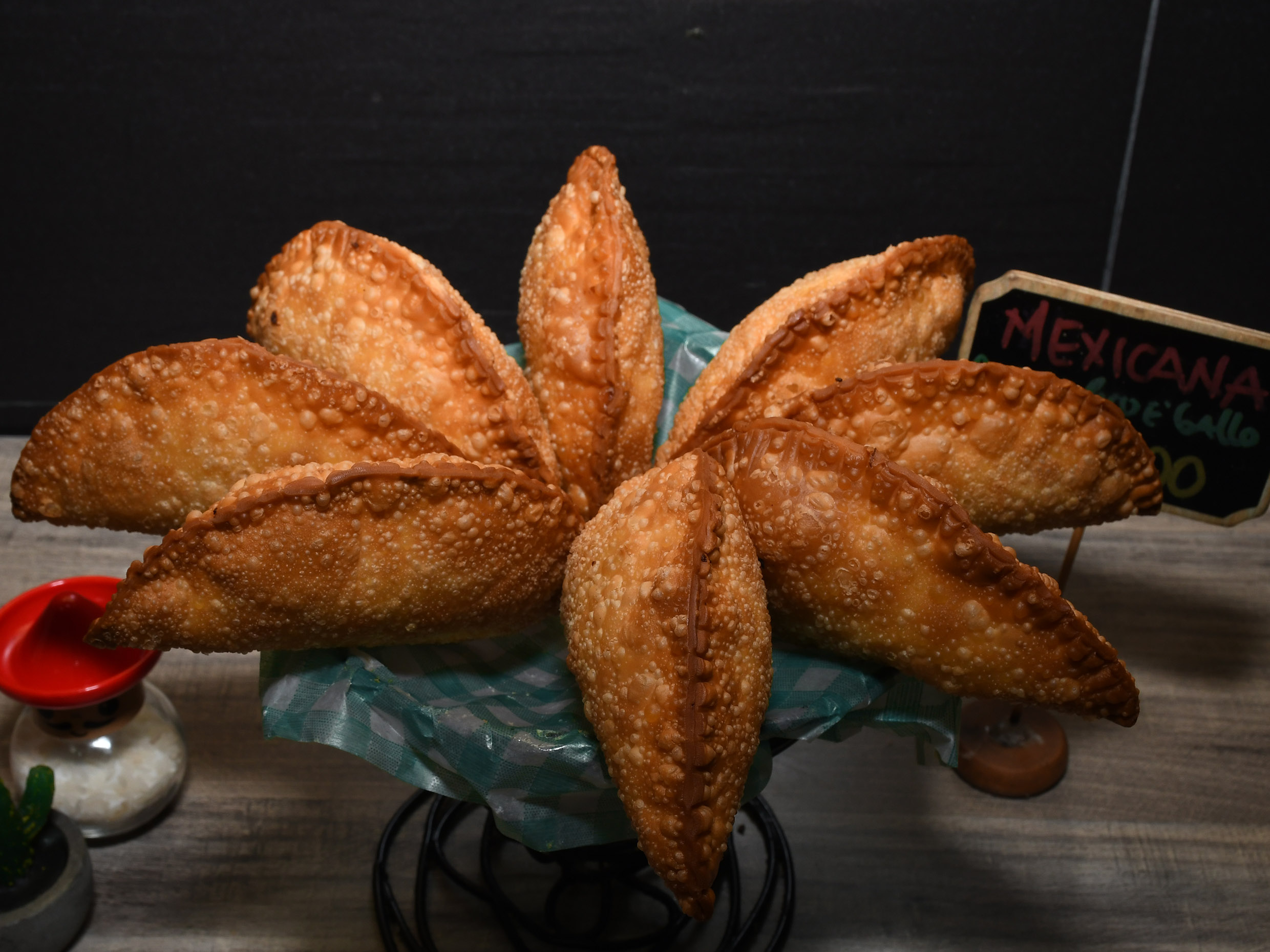 Tortilla de harina, queso fundido, zanahoria, cebolla, pimentón, champiñón, maíz tierno y salsa tártara.