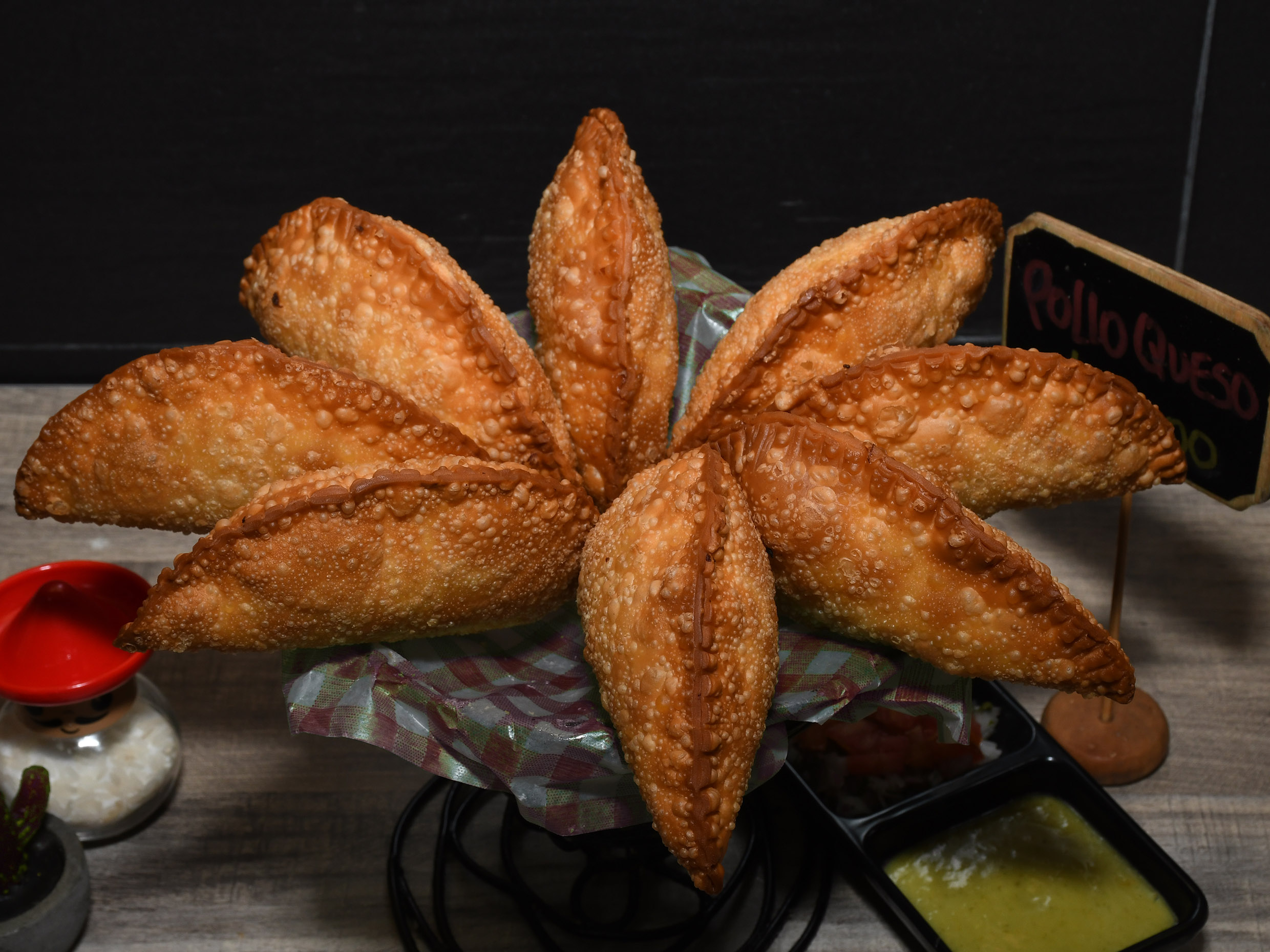 DOBLE CARNE, PAN DE PAPA, PICADO DE CERDO Y /O POLLO, QUESO, CHAMPIÑONES, TOCINETA, HUEVO DE CODORNIZ, MAÍZ TIERNO Y JAMÓN, ACOMPAÑADO DE PAPA Y GASEOSA
