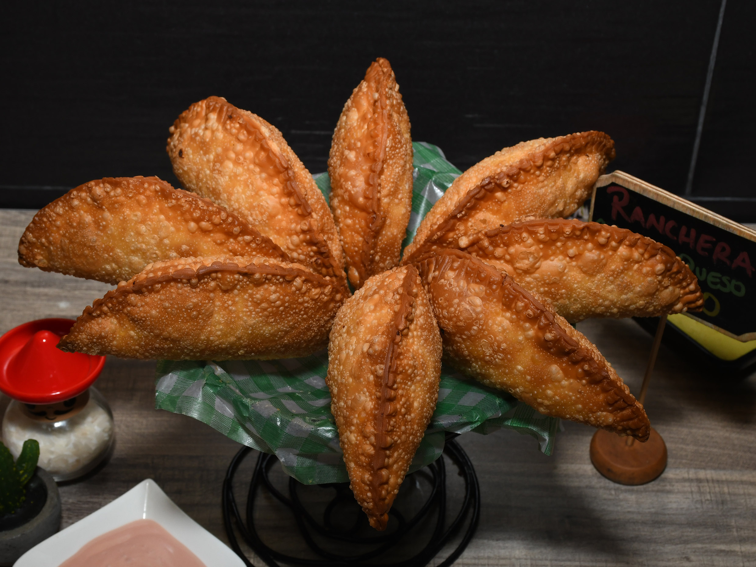 Tortilla de harina, queso fundido, res, pollo, maiz tierno, champiñon, salsa tártara.