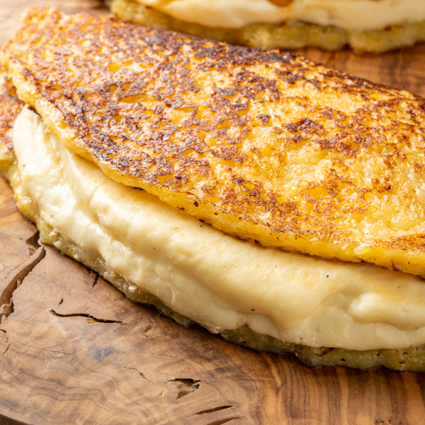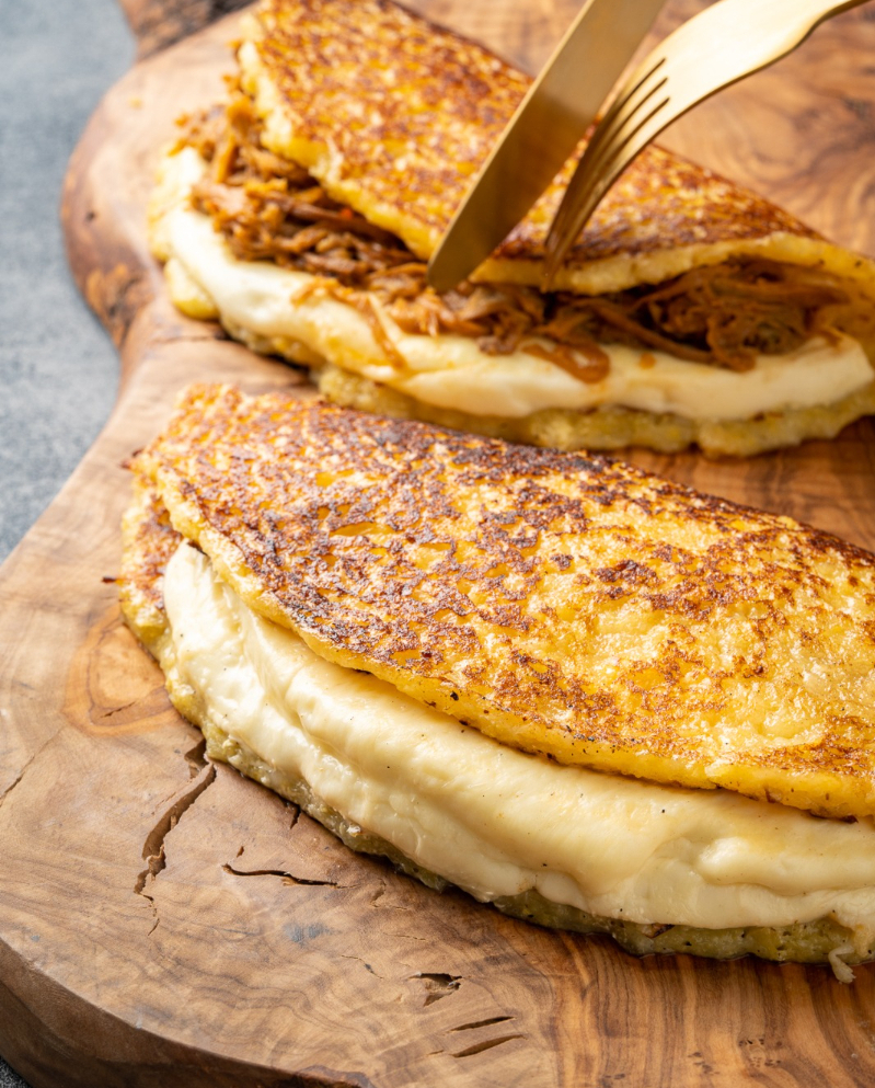 Queso de mano, carne desmechada, caraotas, plátanos, queso llanero.