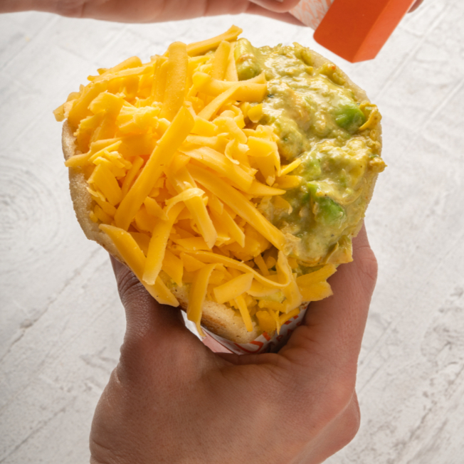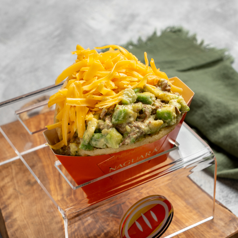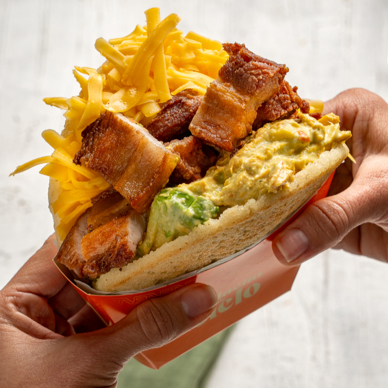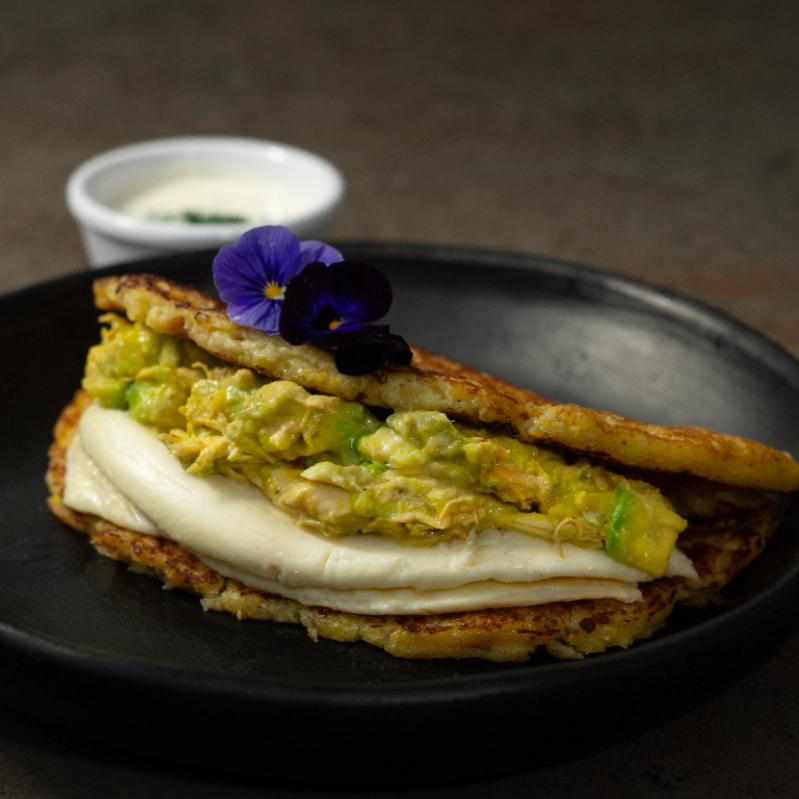 Pollo desmechado, aguacates, salsa guasacaca, queso amarillo holandés.