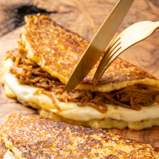Carne desmechada, aderezo de reina pepiada, queso amarillo holandés.