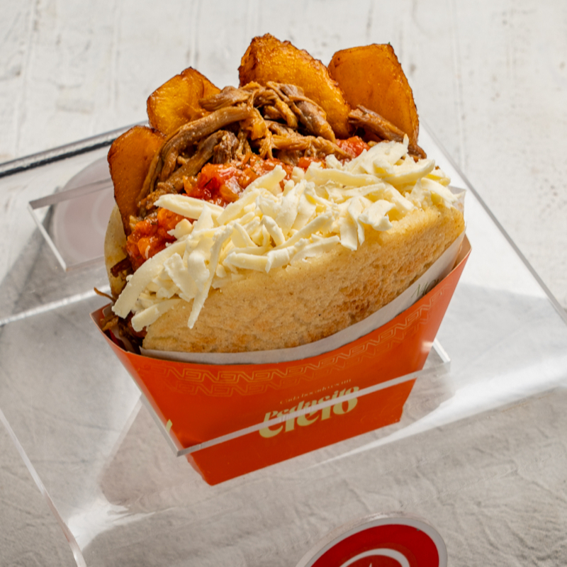 Carne desmechada, hogao, plátanos, salsa guasacaca y queso llanero.