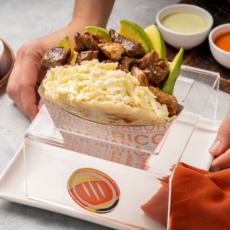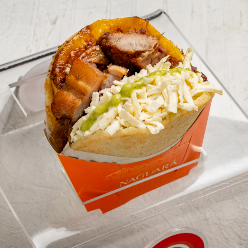 Arepa Naguará (Cerdo Parrilla, Pollo Parrilla, Lomito Parrilla, Chorizo, Maíz Tierno, Aguacates, Queso Campesino) con una Coca-Cola original de 250ml.