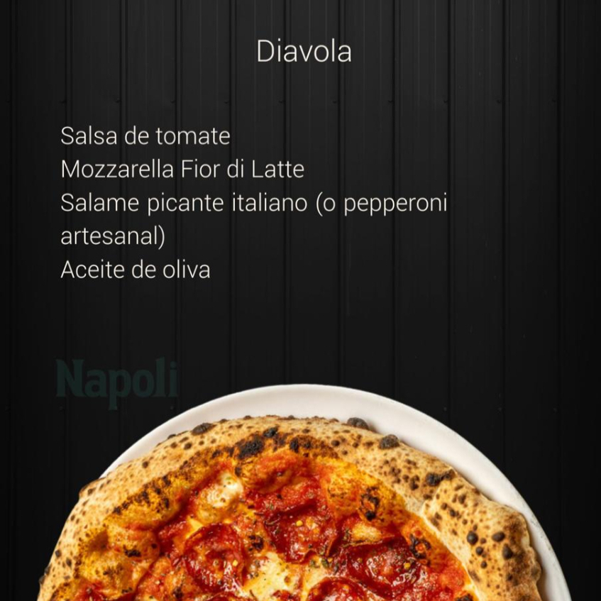 Pizza artesanal de 30 cm con Salsa de tomate, Mozzarella Fior di Latte Salame picante italiano (o pepperoni artesanal) Aceite de oliva