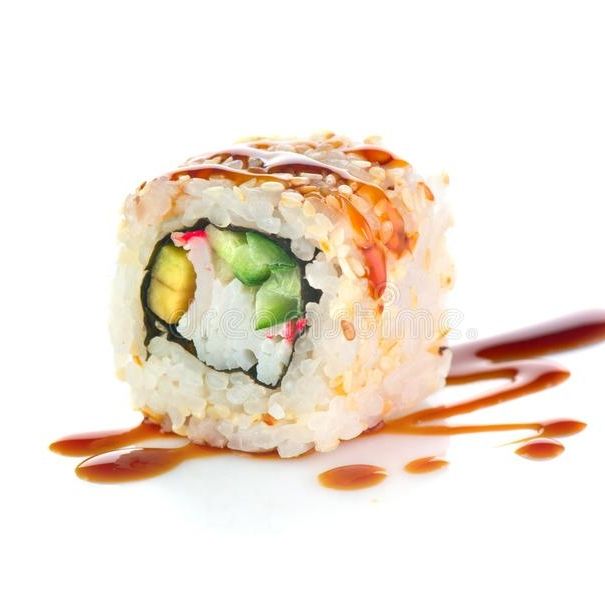 6 bocados de sushi rellenos de queso crema, aguaate y salmon fresco. con ajonjoli por fuera