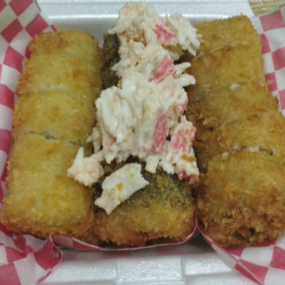 Calamar apanado, aguacate, queso crema y topping de palmito de cangrejo