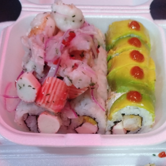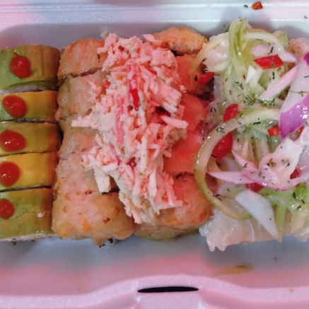 Salmon, tilapia, palmito de cangrejo, pepino, wakame, vegetales, tempura, aguacate y salsa chile dulce.