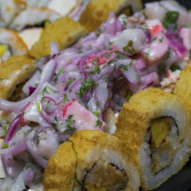 1 rollo de (10u de sushi ) * 1 porción de arroz al wok * 1 porción de ceviche mixto * 1 ración de croquetas * Postre