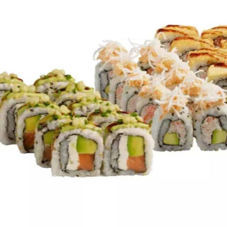 30 makis + 2 U croquetas + 2 U Deditos de calamar crunck + postre gratis ( 1/2 apanado roll, 1/2 crispy roll , 1/2 California roll , 1/2 Dinamita roll , 1/2 calamar roll , 1/2 explosión roll)