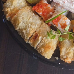 Palmito de cangrejo, queso crema, aguacate, topping de masago, ajonjolí, rebozado de camarones tempurizados y salsa de la casa.