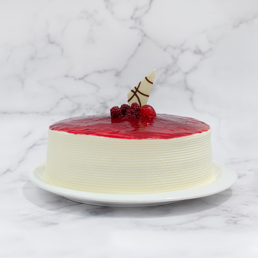 Bizcochuelo blanco humectado en las tres leches, con una capa de crema de frutos rojos y yogurt griego, cubierta de crema de yogurt Griego; decorado con fresa, ciruela, cereza y agraz, con chips de chocolate. Conservarse refrigerado.