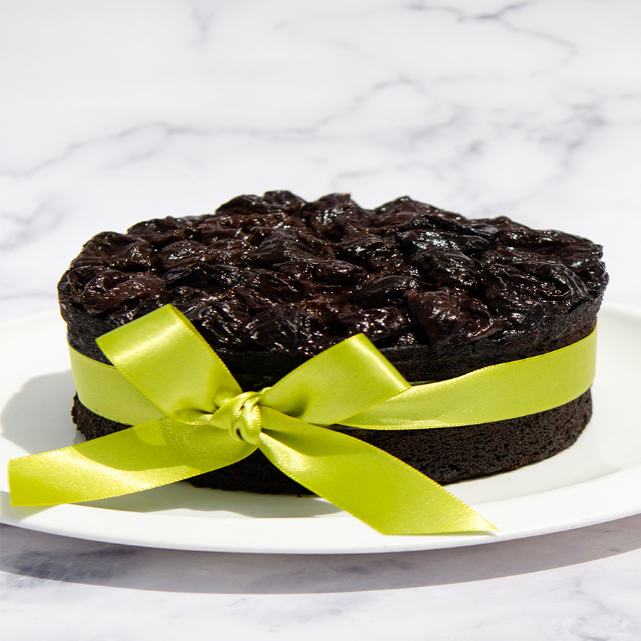 Ponqué de masa negra en mantequilla, con uvas y ciruelas pasas; conservado en vino tinto.