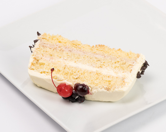 Bizcochuelo blanco humectado en las tres leches de los frutos rojos, cubierta de crema mediterránea y decorado con fresa, ciruela, cereza, amarena y agraz, con chips de chocolate.