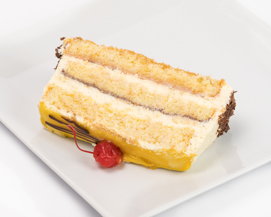 Bizcochuelo blanco, con una capa de arequipe y chocolate, cubierta con crema de y salsa de maracuyá; decorada con cerezas, líneas de chocolate y un aplique de chocolate negro. Conservarse refrigerado.