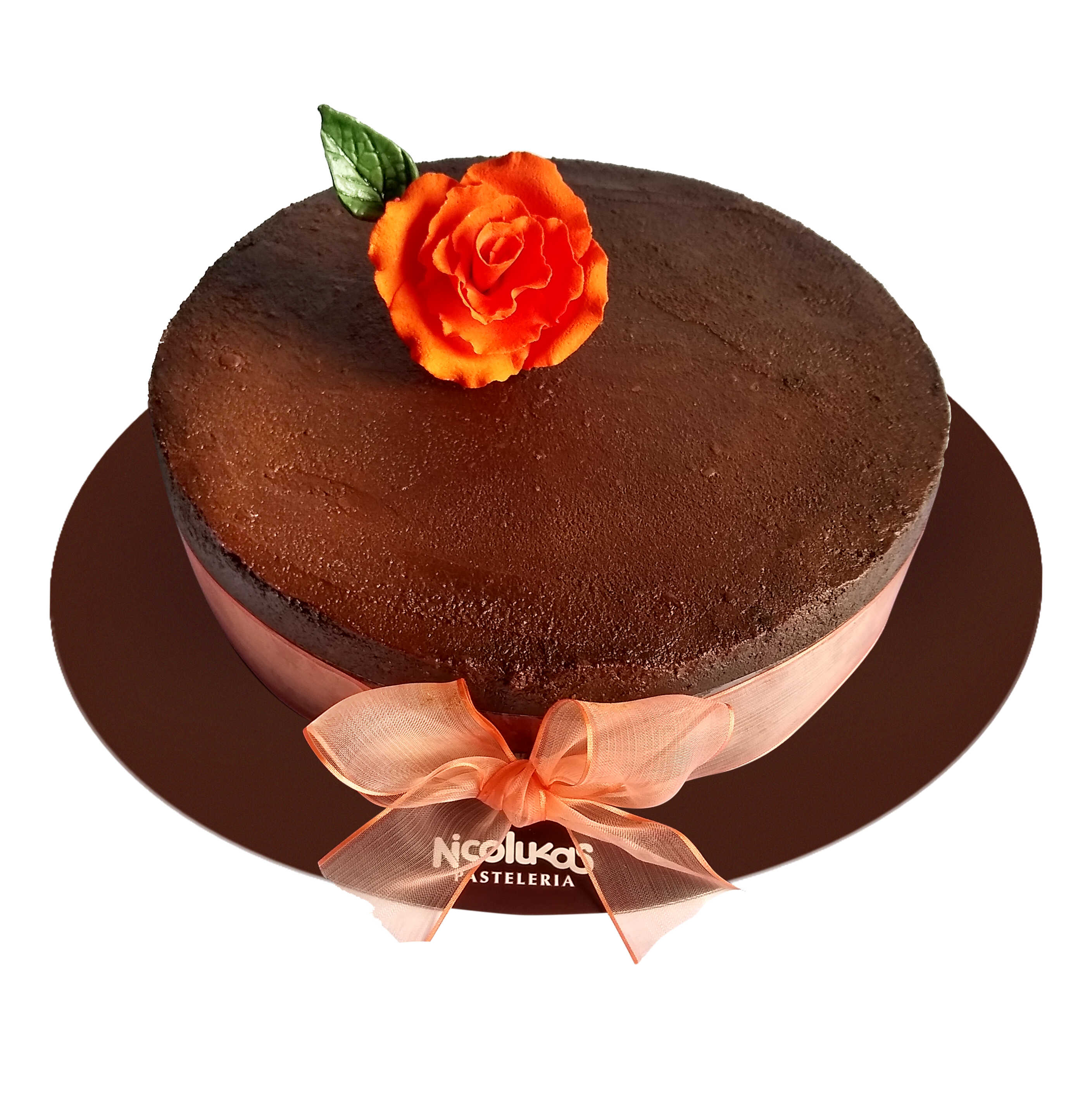 Bizcochuelo blanco, sin cubierta de crema de leche, relleno con una capa de arequipe, chocolate y salsa de maracuyá; decorada con lineas de chocolate y cerezas, un aplique de chocolate negro. Conservarse refrigerado.