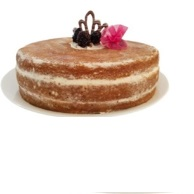 Bizcochuelo blanco bañado en las tres leches, con una capa de crema de leche, cubierta en crema de leche y salsa de mora; decorada mora y apliques de chocolate blanco. Conservarse refrigerado.