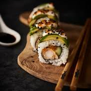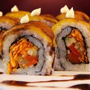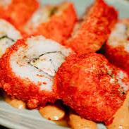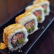 (10 makis) Langostino tempura y kanikama, con aguacate. Cubierto con salsa dinamita, masago y toque de sriracha.