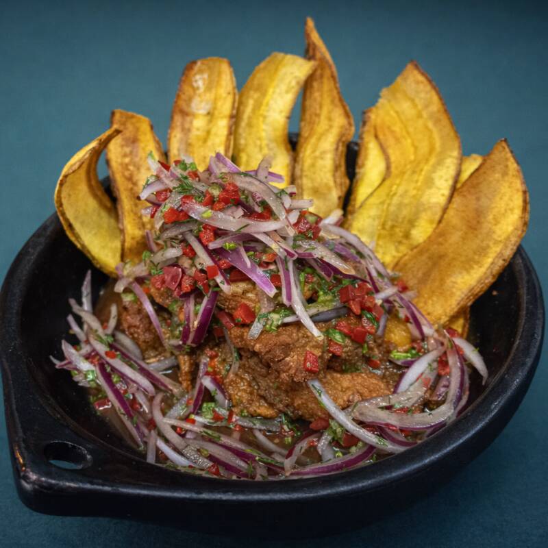 150 gr de chicharron crocante, cebolla morada, limón, cilantro, ají, acompañado de maduros crocantes