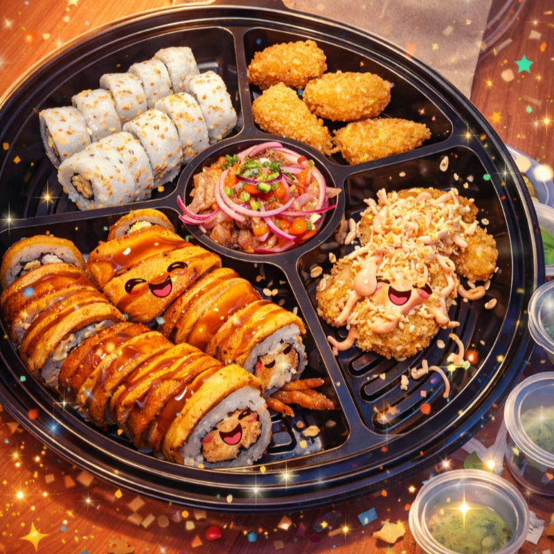 (10 makis) Calamar crispy, platanito y queso crema. Envuelto en ajonjolí, con topping de camarones y toque ahumado.